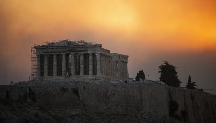 Пожары бушуют на вершинах холмов за храмом Парфенон в Афинах, 12 августа 2024 года. Фото: Ангелос Цорцинис/AFP/Getty Images