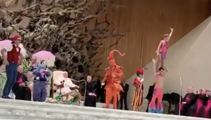 Выступление цирковых артистов перед папой и кардиналами в Ватикане. Фото: скриншот facebook.com/AgenziaAdnKronos