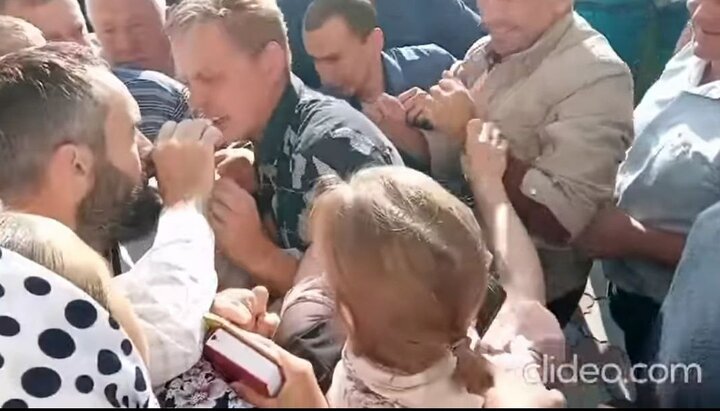 На видео, кроме агрессивного нападения на прихожан УПЦ, которые защищали свою святыню, видно, как «священнослужитель» ПЦУ ударил по голове настоятеля храма протоиерея Александра.