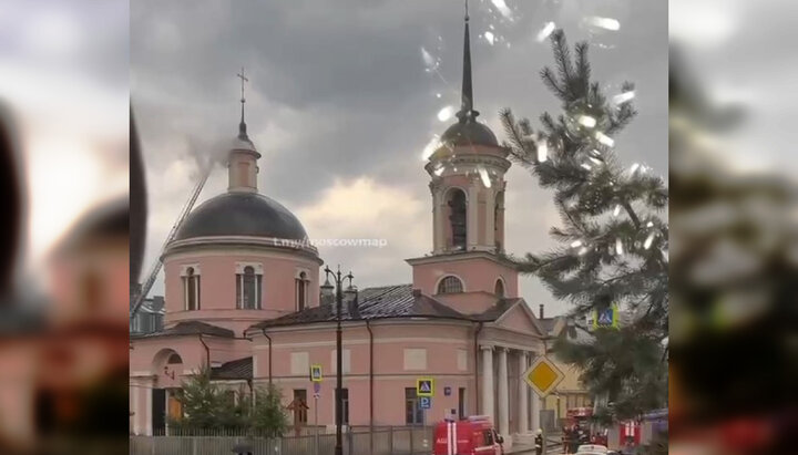Пожар в храме в центре Москвы. Фото: скриншот видео Telegram-канала «Новости Москвы»