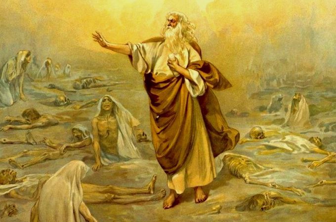 В плену пророк Иезекииль жил при реке Ховар. Там, на 30-м году жизни, в видении ему было открыто будущее еврейского народа и всего человечества. Пророк увидел сияющее облако, в середине которого был пламень, а в нем – таинственное подобие движимой духом колесницы и четырех крылатых животных, каждое из которых имело по четыре лица: человека, льва, тельца и орла. Перед их лицами находились колеса, усеянные очами. Над колесницей возвышался как бы кристальный свод, а над сводом – подобие престола как бы из сверкающего сапфира. На этом престоле – сияющее «подобие Человека», а вокруг Него – радуга.