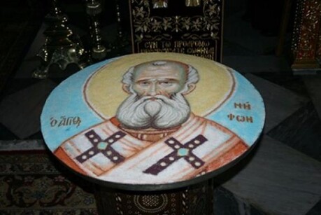 На коливе принято изображать святого, день памяти которого отмечается. Рисуют обычно цветным сахаром. Коливо помещают в храме рядом с иконой святого. Выглядит оно, как икона. После богослужения коливо раздают инокам и многочисленным паломникам. Его употребляют в течение дня, пока пшеница не засохла.