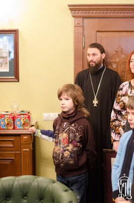 На память о встрече дети подарили Предстоятелю свою картину. Его Блаженство поблагодарил за такой особый дар, вручил всем сладости и раздал маленькие иконы Рождества Христова в благословение.
