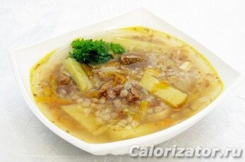 В кипящую воду опустить подготовленный нарезанный картофель, через 10 минут добавить промытую гречневую крупу, морковь, натертую на крупной терке, лук, сушеную или свежую зелень и коренья, соль.