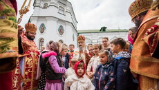 Блаженнейший владыка окропил всех, кто собрался на молитву в обители, а особенно детей, которые пришли помолиться перед началом учебного года.