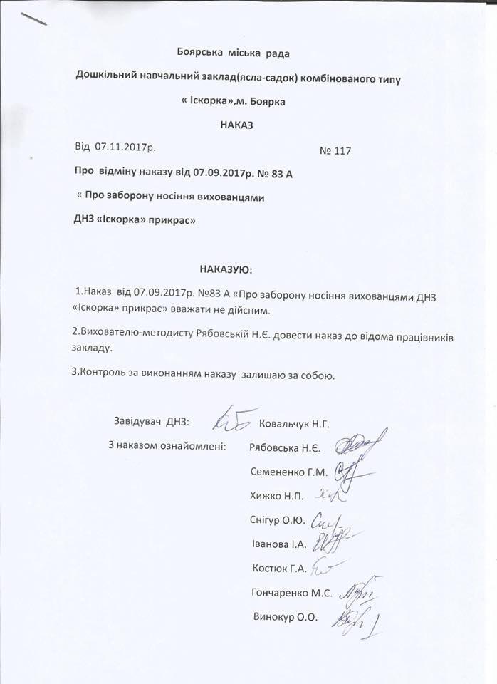 Ранее, в детском саду издали приказ, вводящий запрет на ношение украшений, к которым отнесли нательные крестики. В качестве причины запрета назвали безопасность детей и возможность потери детьми ценных вещей. Просьбы родителей отменить запрет заведующая детского сада Н.Ковальчук игнорировала в течение нескольких месяцев.