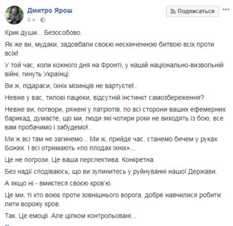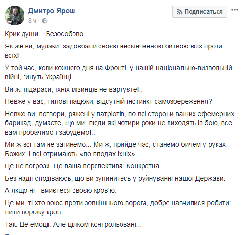 Он добавил, что, если псевдопатриоты не остановятся в разрушении нашего государства – «умоются своей кровью»: «Это мы, те, кто воюет против внешнего врага, хорошо научились делать: лить вражескую кровь», – добавил он.