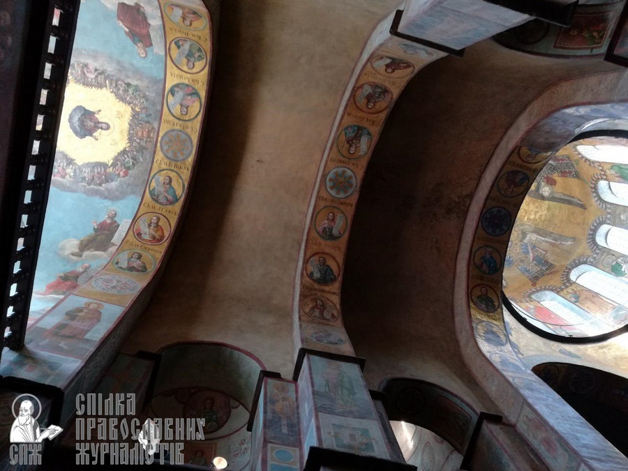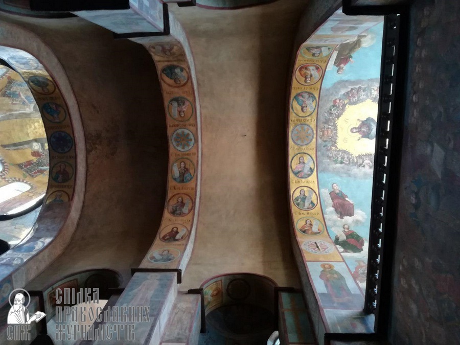 «В Украине не так много церквей XVIII века, где была бы сохранена система росписи. Интересно и то, что расписывал тогда Софию иконописец Киево-Печерской лавры Иринарх, – пояснила эксперт. – Его очень ценил в то время киевский митрополит Филарет Амфитеатров. Так вот, отец Иринарх и его ученики работали не только над новыми композициями, они восстанавливали фрески, дорисовывали недостающие части. И здесь не только дело в художественной ценности, здесь открываются страницы истории, события того времени и люди той эпохи... В середине XIX века происходит так называемая солнцевская реставрация под руководством профессора Петербургской академии художеств Федора Солнцева».