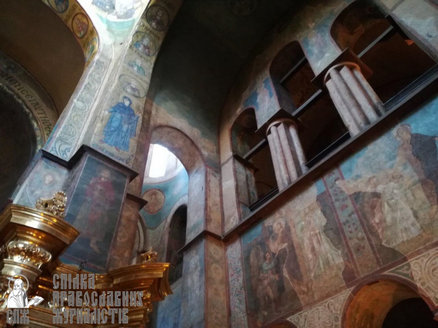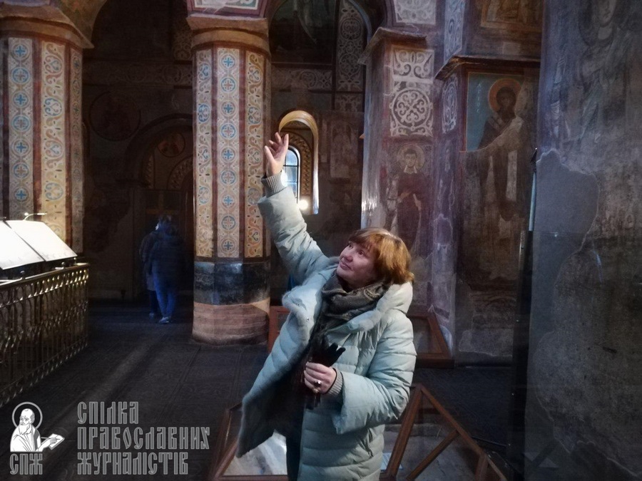 «Собор, заложенный еще в 1011 году князем Владимиром, крестившим Русь, прежде всего славен своими мозаиками и фресками ХІ века, – рассказала Тамара Николаевна. – А в 1953-1956 годах реставраторы руководствовались атеистической идеологией: из церковной живописи имеют ценность только древние фрески и мозаики, поэтому более позднюю живопись закрасили».