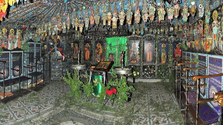 Церковь находится в бывшей штольне по добыче извести, там всегда сыро и влажно, поэтому в скиту не держатся ни штукатурка, ни краски – отсюда и использование бисера для украшений.
