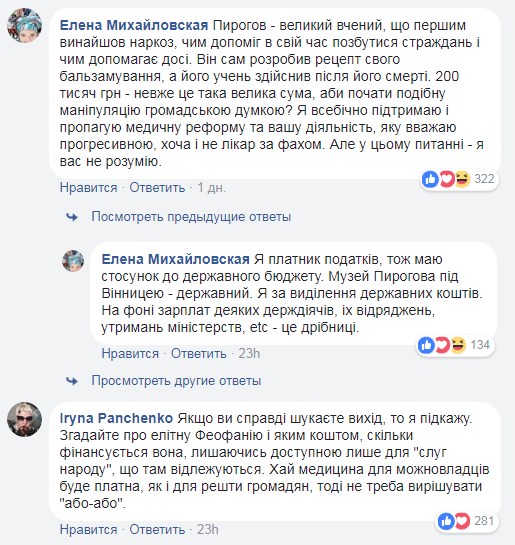 «Пирогов – великий ученый, первым изобрел наркоз, чем помог в свое время избавиться от страданий и чем помогает до сих пор. Он сам разработал рецепт своего бальзамирования, а ученик совершил после его смерти. 200 тысяч гривен – неужели это такая большая сумма, чтобы начать подобную манипуляцию общественным мнением? Я всесторонне поддерживаю и пропагандирую медицинскую реформу и вашу деятельность, которую считаю прогрессивной, хотя и не врач по специальности. Но в этом вопросе – я вас не понимаю», – возмутилась Елена Михайловская.
