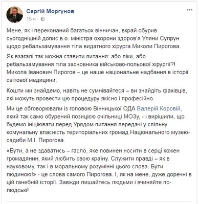 «Николай Иванович Пирогов – это наше национальное достояние в истории мировой медицины. Средства мы найдем, даже не сомневайтесь, – написал мэр Винницы Сергей Моргунов. – «Быть, а не казаться – лозунг, который должен носить в сердце каждый гражданин, который любит свою страну. Служить правде – как в научном, так и в моральном смысле этого слова. Быть человеком» – это слова самого Пирогова. И, по-моему, очень уместны в этой позорной истории. Всегда оставайтесь людьми и делайте по-человечески!»