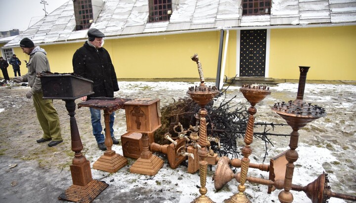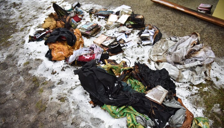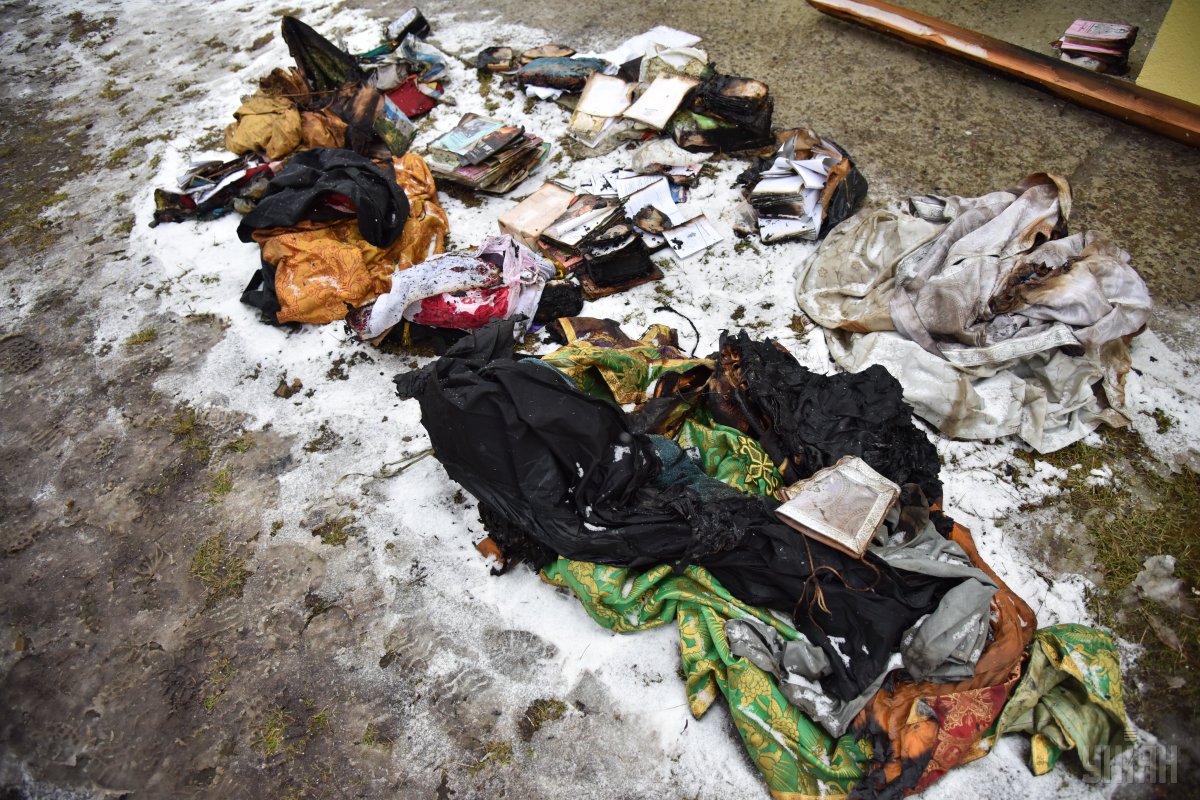 На фотографиях видно, что внутренность храма очень сильно повреждена огнем. Прихожане вынесли остатки церковной утвари на улицу. Фото сделаны на фоне находящейся совсем рядом церкви УПЦ КП.