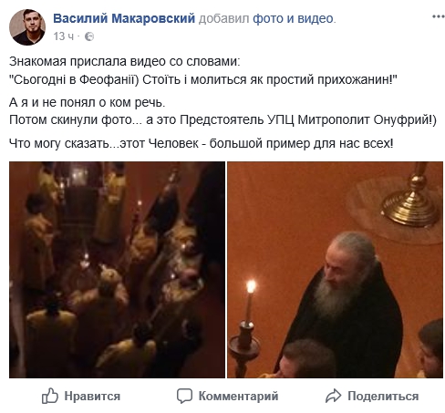 «Знакомая прислала видео со словами: "Сьогодні в Феофанії) Стоїть і молиться як простий прихожанин!" А я и не понял, о ком речь. Потом скинули фото... а это Предстоятель УПЦ Митрополит Онуфрий! Что могу сказать... этот Человек – большой пример для нас всех!» – комментирует участник православной молодежки.