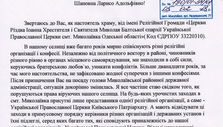 «Я все чаще становлюсь свидетелем нарушений прав верующих нашего поселка. На торжественных мероприятиях в пгт Николаевка можно заметить присутствие лишь одной религиозной организации – Украинской Православной Церкви Киевского патриархата. Известны факты, когда Вы вызывали в свой кабинет и, под давлением своей должности, указывали, в какую церковь людям ходить и каким образом молиться», – пишет священнослужитель.