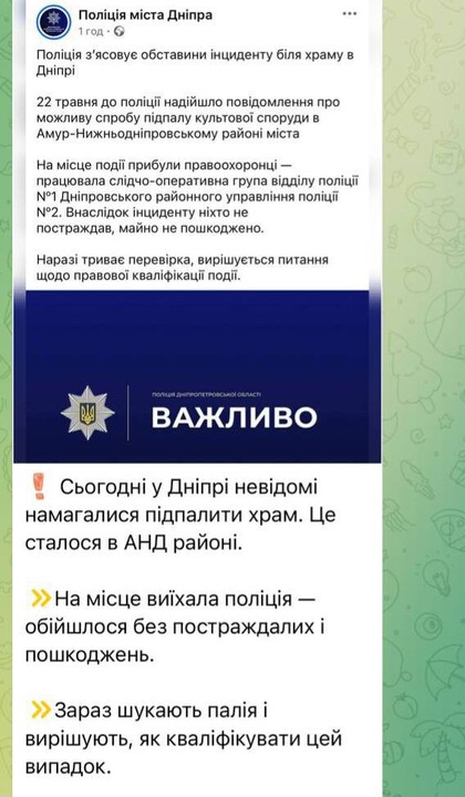 22 мая 2025 года храм УПЦ в честь иконы Богородицы «Скоропослушница» в Днепре пытались поджечь. Как сообщил у себя на странице в Фейсбук клирик прихода протоиерей Георгий Скубак, следы неудачного поджога верующие обнаружили утром, перед началом праздничной литургии.