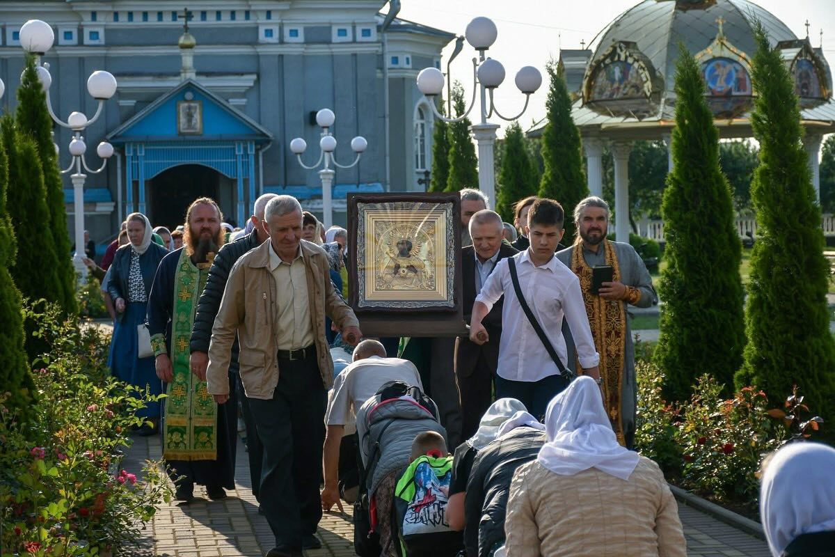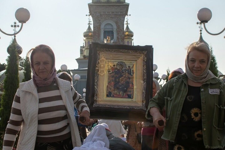 Впереди колонны несли икону святого благоверного великого князя Александра Невского – покровителя храма; икону преподобных Иова и Амфилохия Почаевских – чудотворцев и молитвенников за родную землю; икону Божьей Матери «Пантанасса» («Всемилостивая») – перед которой молятся об исцелении от тяжелых недугов и заступничестве для всего народа.