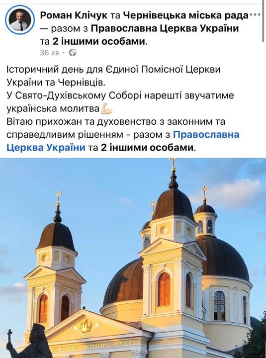 17 июня 2025 года сразу после захвата Свято-Духовского собора УПЦ в Черновцах мэр города Роман Кличук опубликовал в своем Фейсбуке поздравления в адрес ПЦУ.
