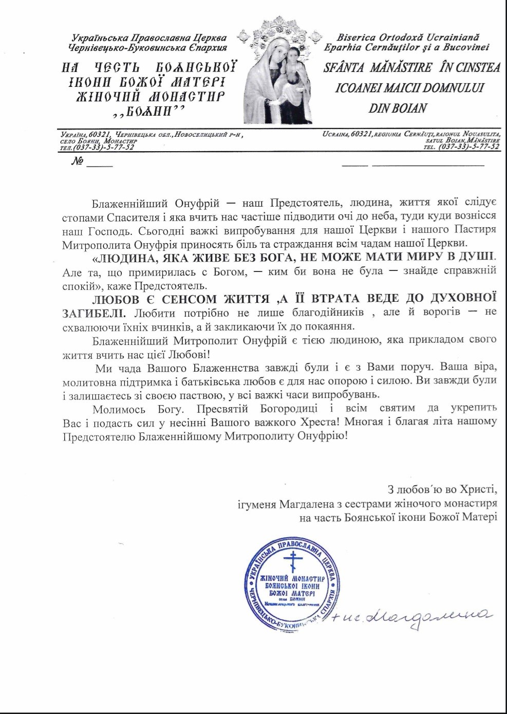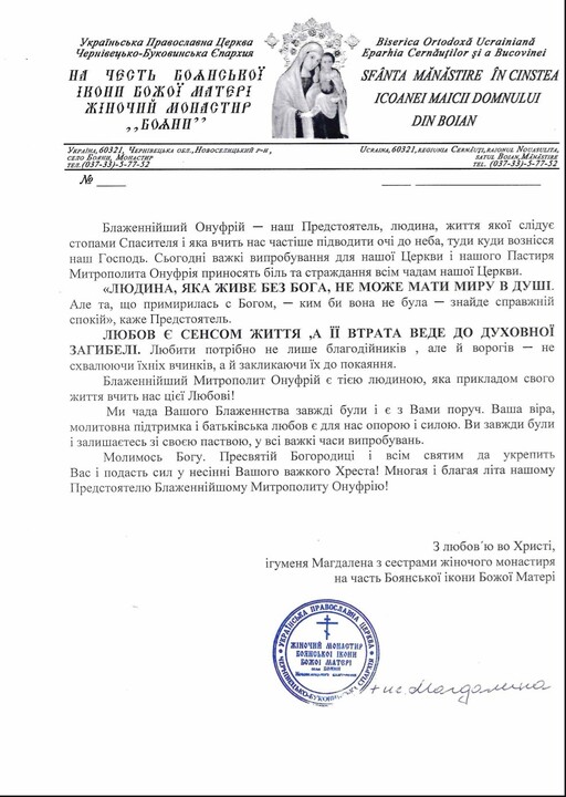 «Блаженнейший Онуфрий – наш Предстоятель, человек, жизнь которого следует по стопам Спасителя и который учит нас чаще поднимать глаза к небу, туда, куда вознесся наш Господь. Сегодня тяжелые испытания для нашей Церкви и нашего Пастыря Митрополита Онуфрия приносят боль и страдания всем чадам нашей Церкви», – говорится в послании Боянского монастыря.