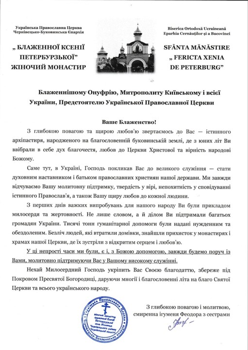 Сестры женских монастырей Черновицко-Буковинской епархии УПЦ – в честь Боянской иконы Божией Матери и блаженной Ксении Петербургской – направили письма поддержки Блаженнейшему Митрополиту Онуфрию. Об этом сообщили в Фейсбуке Банченской обители.
