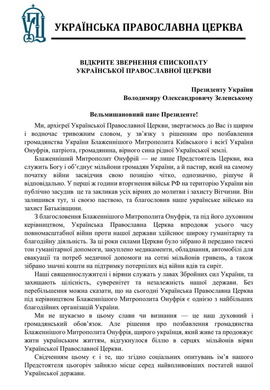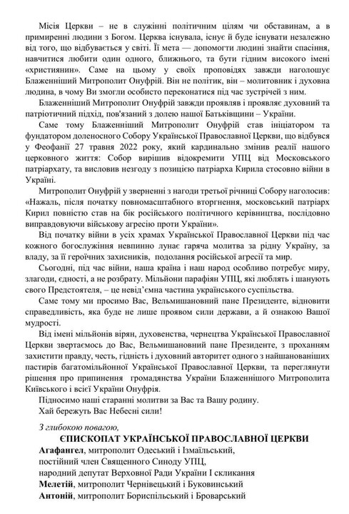 Мы, архиереи Украинской Православной Церкви, обращаемся к Вам с искренним и одновременно тревожным словом, в связи с решением о лишении гражданства Украины Блаженнейшего Митрополита Киевского и всея Украины Онуфрия, патриота, гражданина, верного сына родной Украинской земли.
