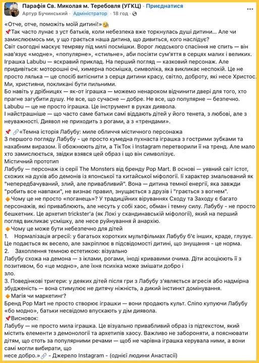 В Facebook-группе Николаевского прихода УГКЦ в Теребовле разместили публикацию с предостережением для родителей относительно популярной игрушки Лабубу, которая названа «орудием диавола». После появления насмешек и критики пост удалили, но в скриншотах она осталась.