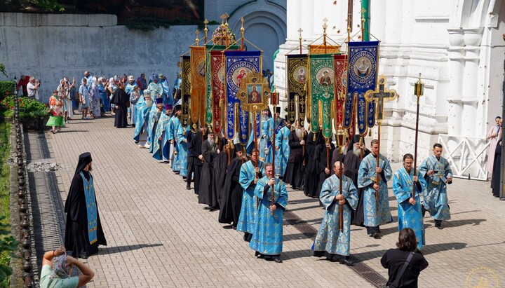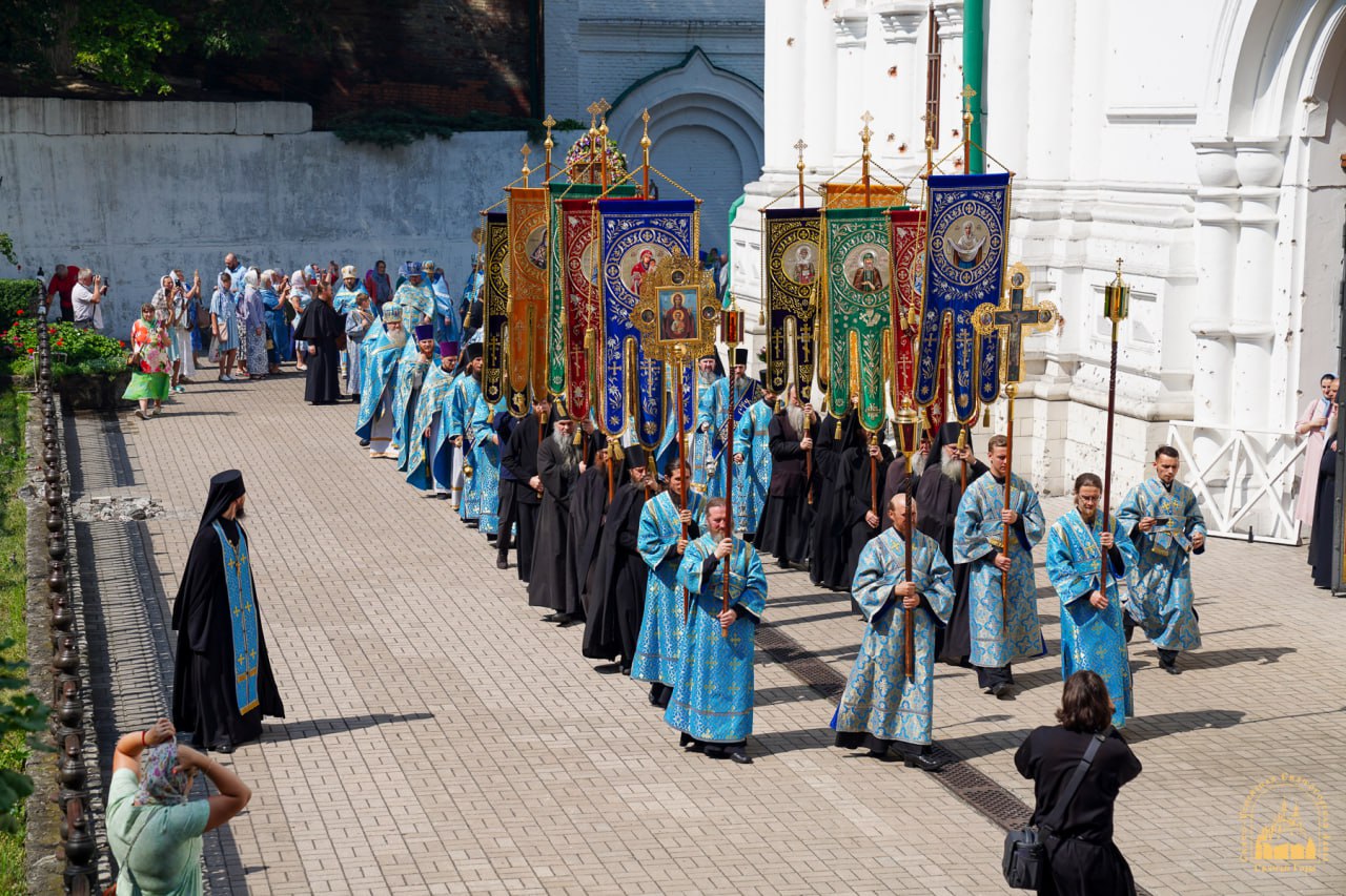После завершения богослужения состоялся традиционный крестный ход. Святогорскую чудотворную икону Богородицы с молебным пением обнесли по территории лавры, затем образ вновь вернулся в Успенский собор. На пути в храм у могил погибшей во время обстрела 1 июня 2022 г. братии была отслужена заупокойная лития.