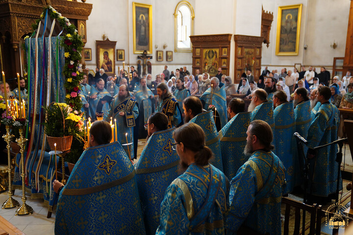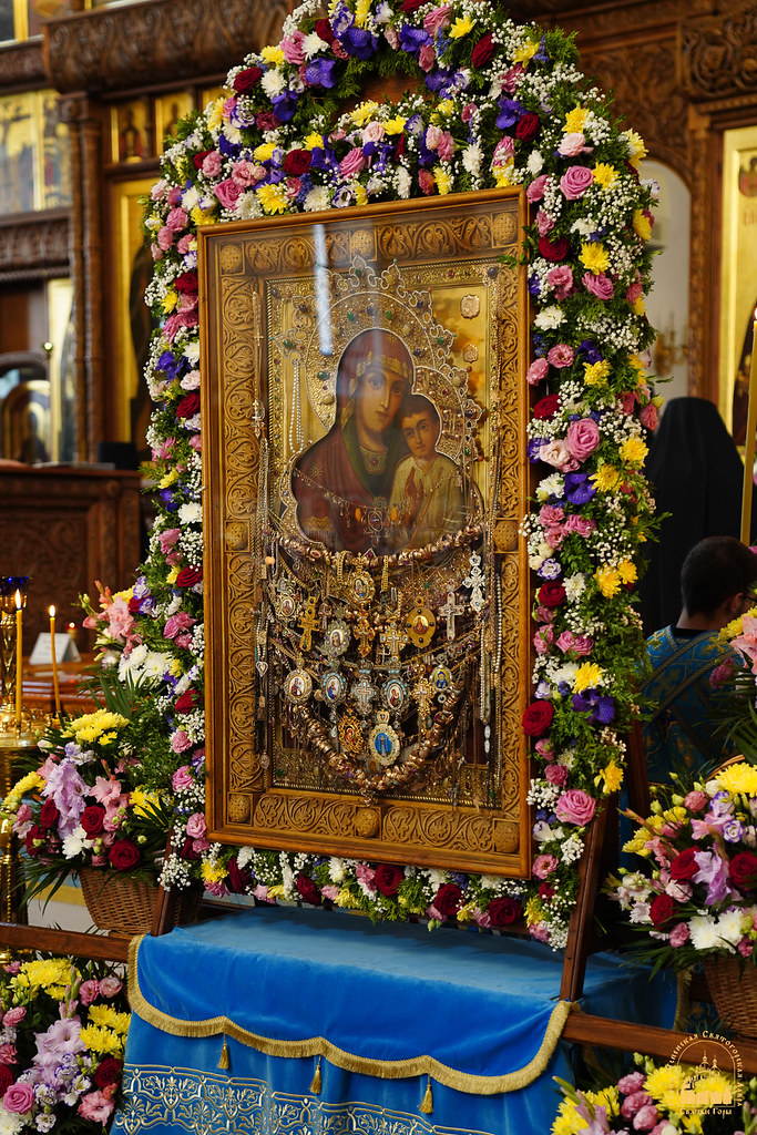 «К началу службы украшенный цветами чудотворный образ Богоматери занял свое место на середине собора напротив Царских врат. Цветы для украшения образа были закуплены на средства, пожертвованные любящими Царицу Небесную и Ее обитель верующими. Над созданием цветочной композиции трудились сестры лаврского скита иконы Божией Матери "Всех скорбящих Радость"», – рассказали в лаврской пресс-службе.