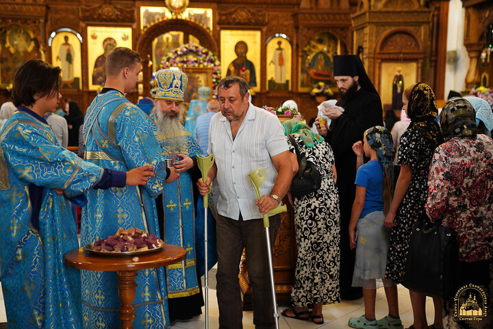 В этот день ко Причастию Святых Христовых Таин подошли все участники праздника. Братию и паломников причащали из пяти чаш.