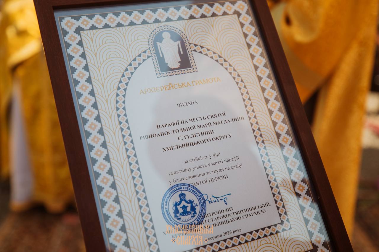 4 августа 2025 года, в день престольного праздника прихода УПЦ в честь святой равноапостольной Марии Магдалины, митрополит Хмельницкий и Староконстантиновский Виктор совершил Божественную литургию в селе Гелетинцы Хмельницкого района. Об этом сообщила епархиальная пресс-служба.