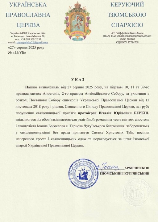 Архиепископ Изюмский и Купянский Иоанн своим указом от 27 августа 2025 года запретил в служении бывшего настоятеля храма УПЦ святого апостола и евангелиста Иоанна Богослова с. Тернова Чугуевского благочиния в Харьковской области протоиерея Виталия Юрьевича Беркина. Об этом сообщает пресс-служба Изюмской епархии.