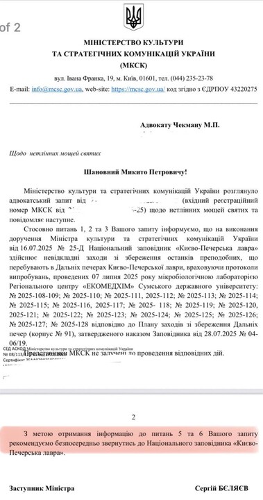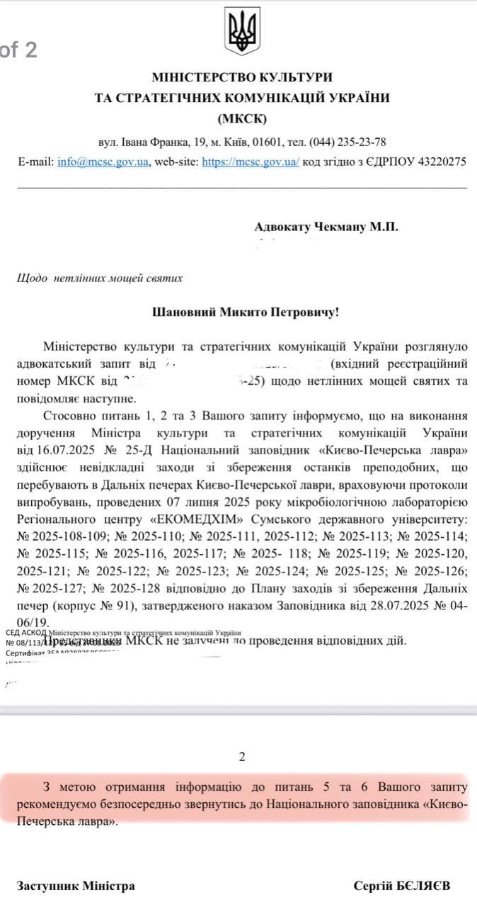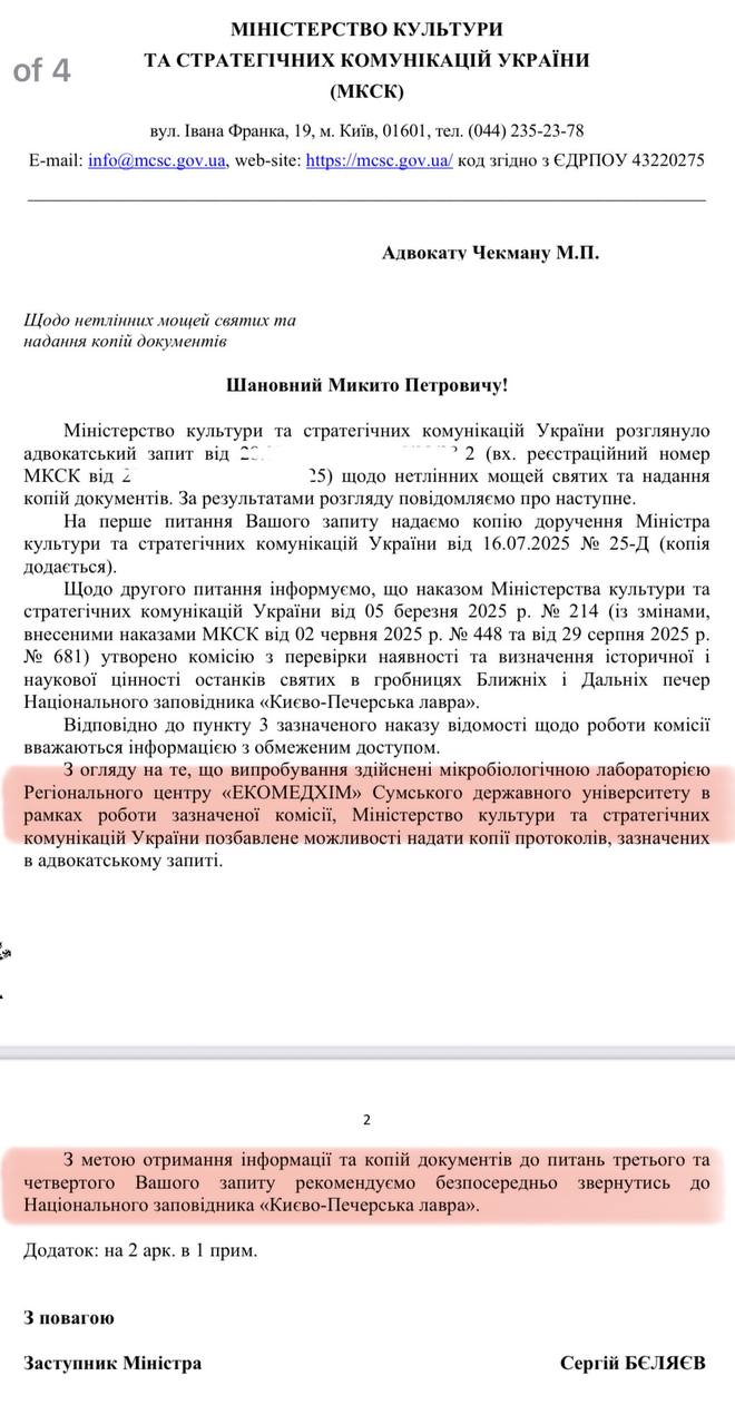 Микробиологическая лаборатория Сумского государственного университета «ЭКОМЕДХИМ» проводила «испытания» с мощами преподобных Печерских в Дальних пещерах Киево-Печерской лавры, сообщает адвокат Лавры протоиерей Никита Чекман, публикуя ответ Минкульта на его адвокатский запрос.
