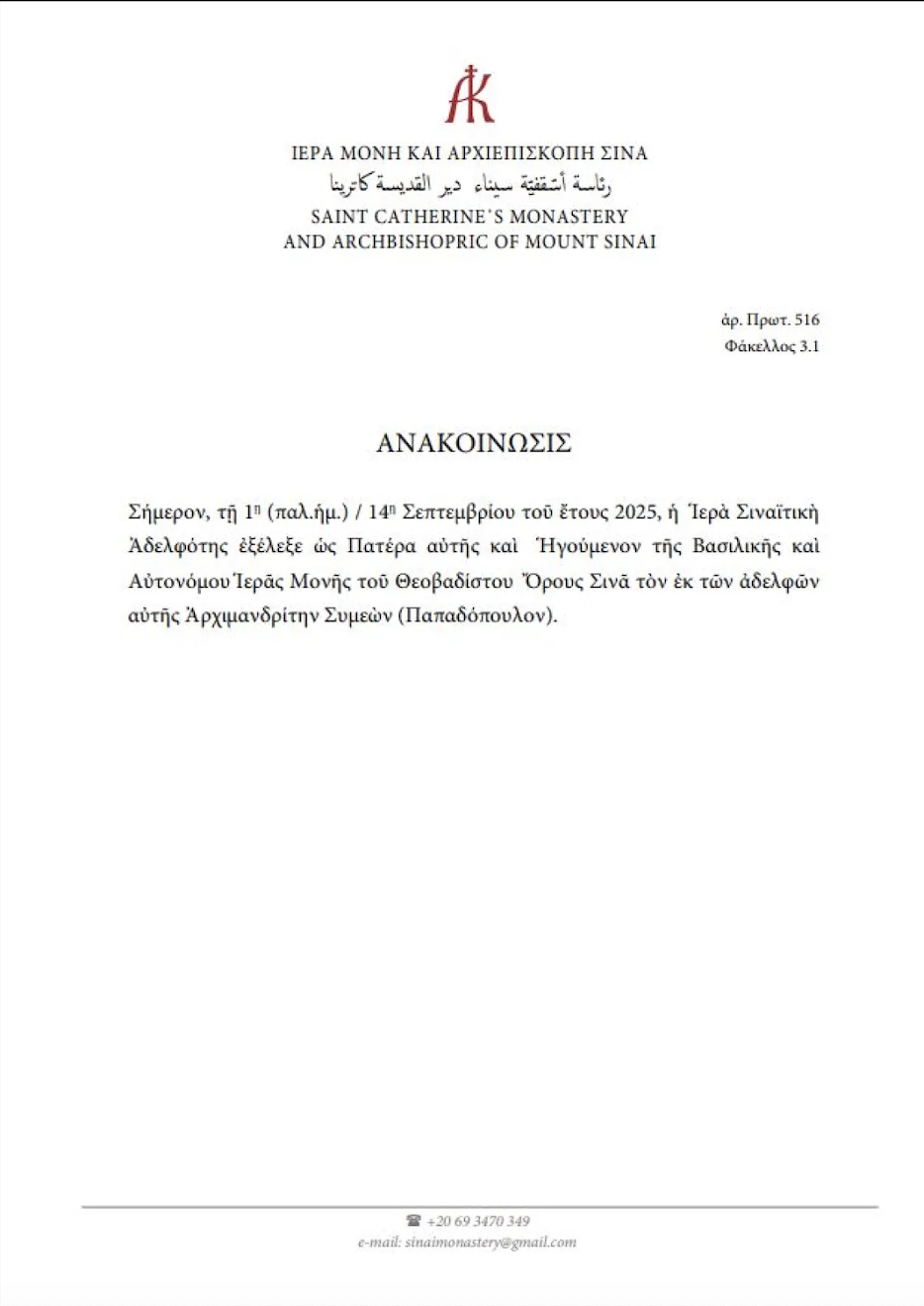 В официальном сообщении Синайского монастыря, опубликованном на сайте parapolitika.gr, говорится: «Сегодня, 14 сентября 2025 года, Святая Синайская братия избрала своим отцом и игуменом Царственного и Автономного монастыря Богоявленной горы Синай архимандрита Симеона (Пападопулоса)».