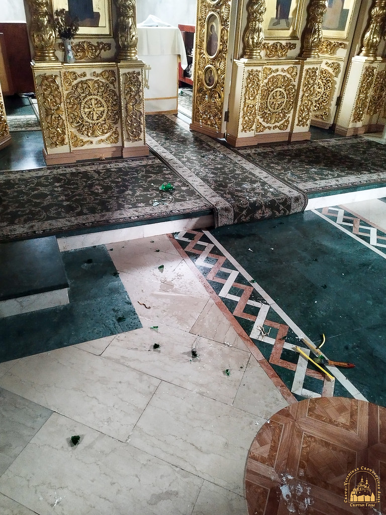 Из нижнего придела храма вынесены четыре подсвечника. Войдя в алтарь, преступники забрали с престола напрестольное и требное Евангелия, напрестольные лампады и подсвечники, семисвечник, распятие с жертвенника и латунный алтарный аналой. Оставшиеся церковные предметы были разбросаны, лампады разбиты. Злоумышленники также вскрыли церковную кружку.