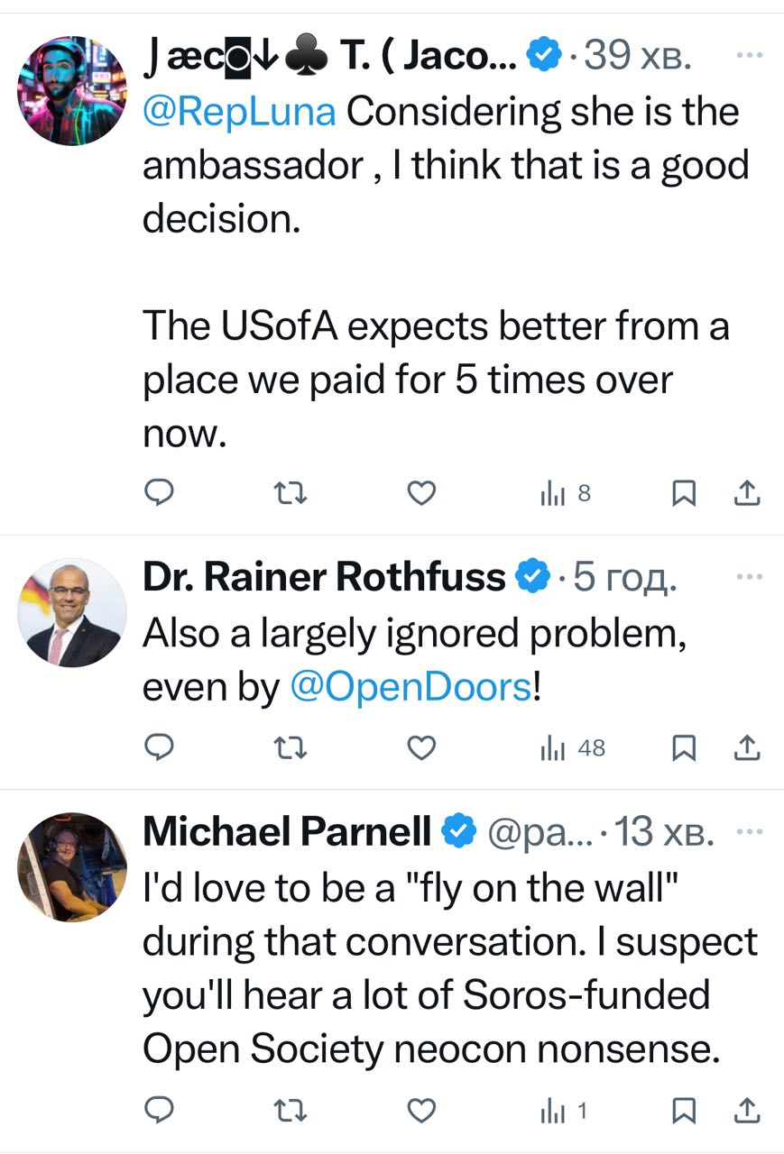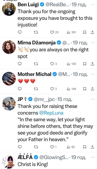 Публикация конгрессвумен США Анны Паулины Луны о продолжающемся захвате храма Рождества Христова в селе Кузьмин вызвала широкий отклик среди американских пользователей сети Х. Комментаторы в целом поддержали позицию политика, подчеркнув, что речь идет не об одном конкретном приходе, а о принципиальном вопросе верховенства закона и защиты религиозной свободы.