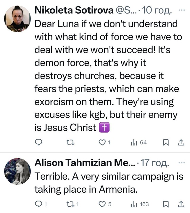 Пользователи Х в комментариях к посту Анны Луны требуют от властей Украины прекратить захваты храмов, а от международного сообщества – дать правовую оценку этим действиям.