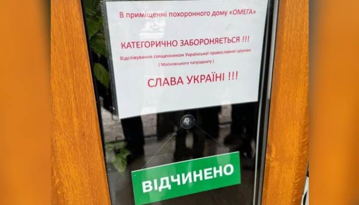 На фотографии изображены входные двери в агентство с надписью «В помещении похоронного дома "Омега" КАТЕГОРИЧЕСКИ ЗАПРЕЩАЕТСЯ!!! отпевание священником Украинской Православной Церкви (Московского патриархата). Слава Украине!!!».