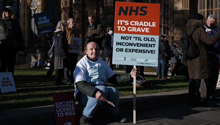 Участник кампании против законопроекта об эвтаназии у Вестминстерского дворца в центре Лондона. Фото: European Conservative. Участник кампании против законопроекта об эвтаназии у Вестминстерского дворца в центре Лондона. Фото: European Conservative.