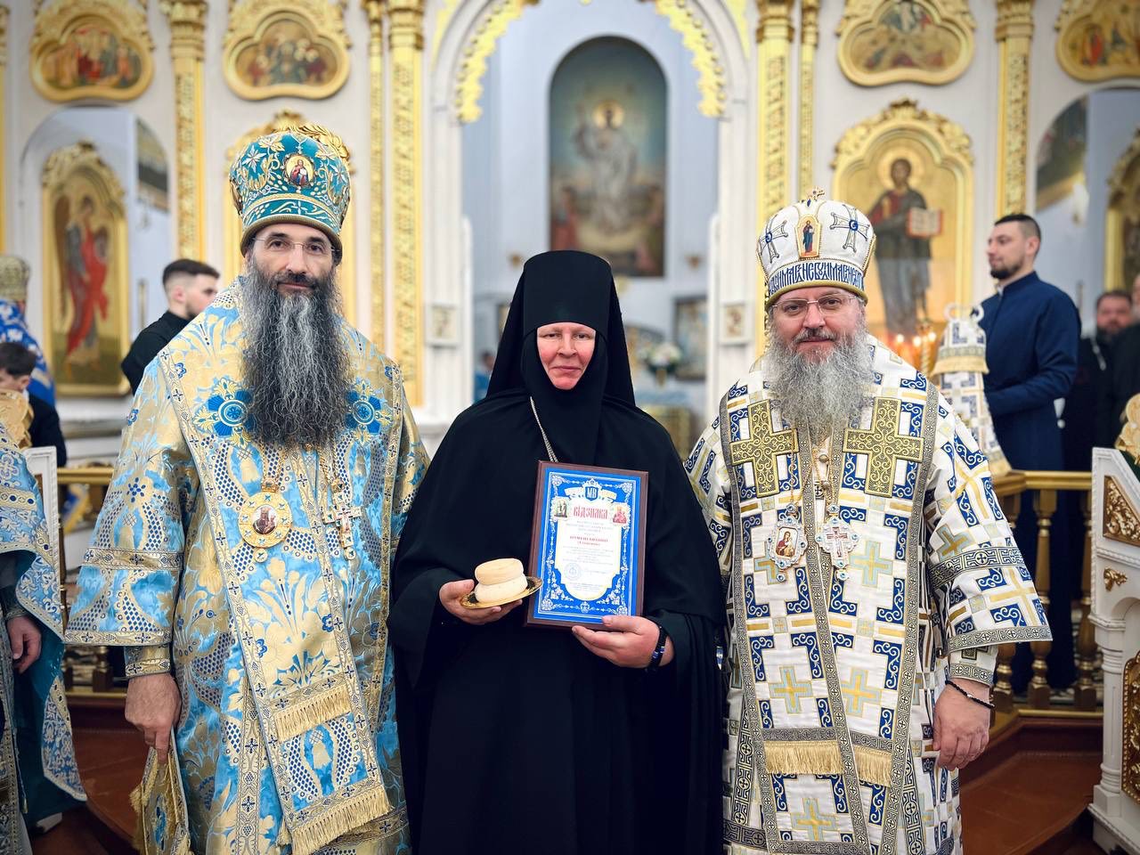 После завершения Литургии духовенство и миряне прошли торжественным крестным ходом вокруг монастырского комплекса с чудотворным образом Богоматери. В конце богослужения иерархи поздравили игуменью Антонию с 30-летием ее возведения в игуменское достоинство. Митрополит Варсонофий поблагодарил матушку за многолетние труды на благо канонической Церкви и вручил ей грамоту.