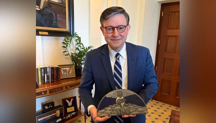 Майк Джонсон и Майк Джонсон и "икона" Христа. Фото: Razom for Ukraine