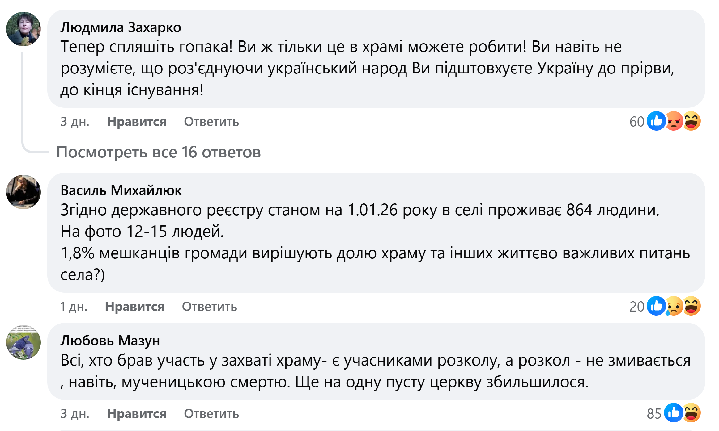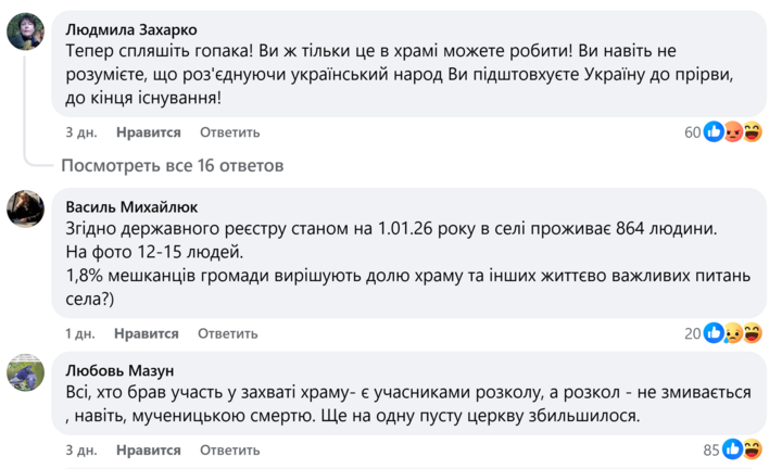 «Согласно государственному реестру по состоянию на 1.01.26 года в селе проживает 864 человека. На фото 12-15 человек. 1,8% жителей общины решают судьбу храма и других жизненно важных вопросов села?», – спрашивает Василий Михайлюк.