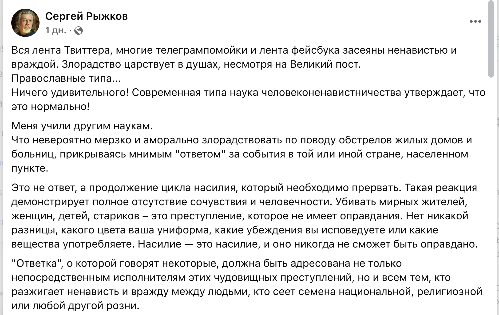 Что невероятно мерзко и аморально злорадствовать по поводу обстрелов жилых домов и больниц, прикрываясь мнимым «ответом» за события в той или иной стране, населенном пункте.
