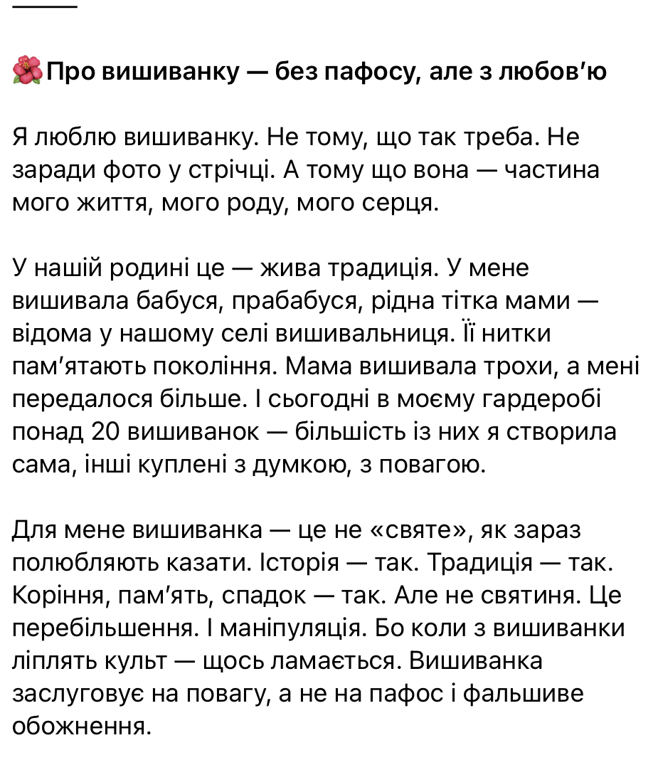 Для мене вишиванка — це не «святе», як зараз полюбляють казати. Історія — так. Традиція — так. Коріння, пам’ять, спадок — так. Але не святиня. Це перебільшення. І маніпуляція. Бо коли з вишиванки ліплять культ — щось ламається. Вишиванка заслуговує на повагу, а не на пафос і фальшиве обожнення.