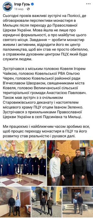 Говоря конкретно про Свято-Никольский Милецкий мужской монастырь, который в течение 30 лет возрождался монахами УПЦ и договор аренды с которым закончился 1 января (чиновники не решаются его продолжить), Гузь призвал депутатов не затягивать вопрос с переводом этого монастыря в ПЦУ. Как утверждает нардеп, когда монахи УПЦ будут выселены и монастырь будет передан ПЦУ, он станет "колыбелью украинского православия на Полесье", "центром паломничества", "духовным центром ПЦУ".