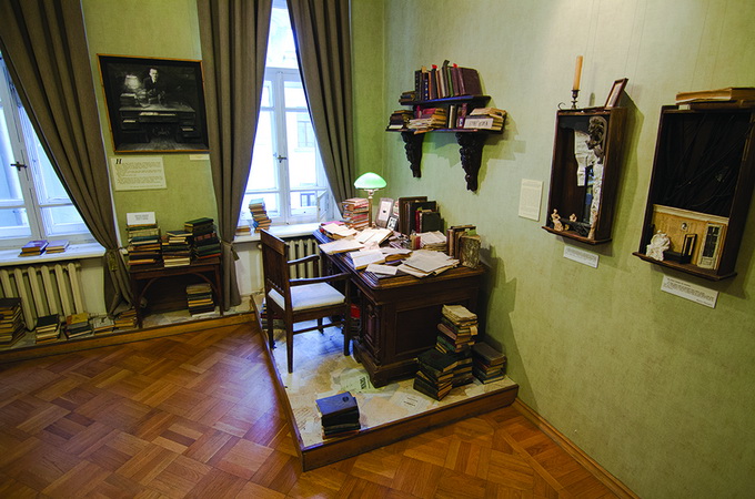 У кабінеті стояв «легендарний» стіл: за ним письменник беззмінно творив протягом більше 8 років, написавши за цей час такі твори, як «Біг», «Кабала святош», «Майстер і Маргарита». Біля стіни стояли книжкові полиці темно-коричневого кольору, а сам кабінет був оформлений в синіх тонах.