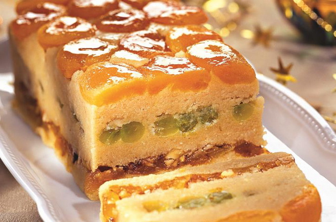 Викласти шарами цілу курагу, 1/3 марципана (можна попередньо пропустити через м'ясорубку або вдруге збити в блендері), 1/2 перемеленої кураги, виноград, ще 1/3 марципана, 1/2 перемеленої кураги, останню 1/3 марципана.