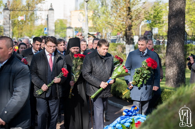 Присутні поклали квіти до меморіального кургану і вшанували хвилиною мовчання пам'ять ліквідаторів аварії на ЧАЕС під поминальний дзвін Свято-Михайлівського храму.