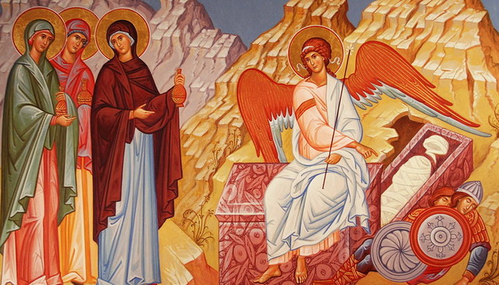 Вісник Божий повідомив жінкам про те, що Спаситель воскрес, після чого вони поспішили до міста, щоб розповісти про це апостолам.
