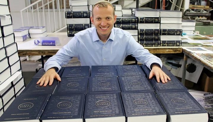 Рабин Тулі Вайц із зразками Біблії Ізраїлю, яку він редагував