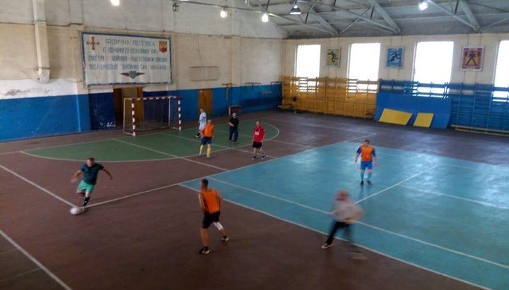 Священики та військові грали у футбол в спортзалі військової частини.